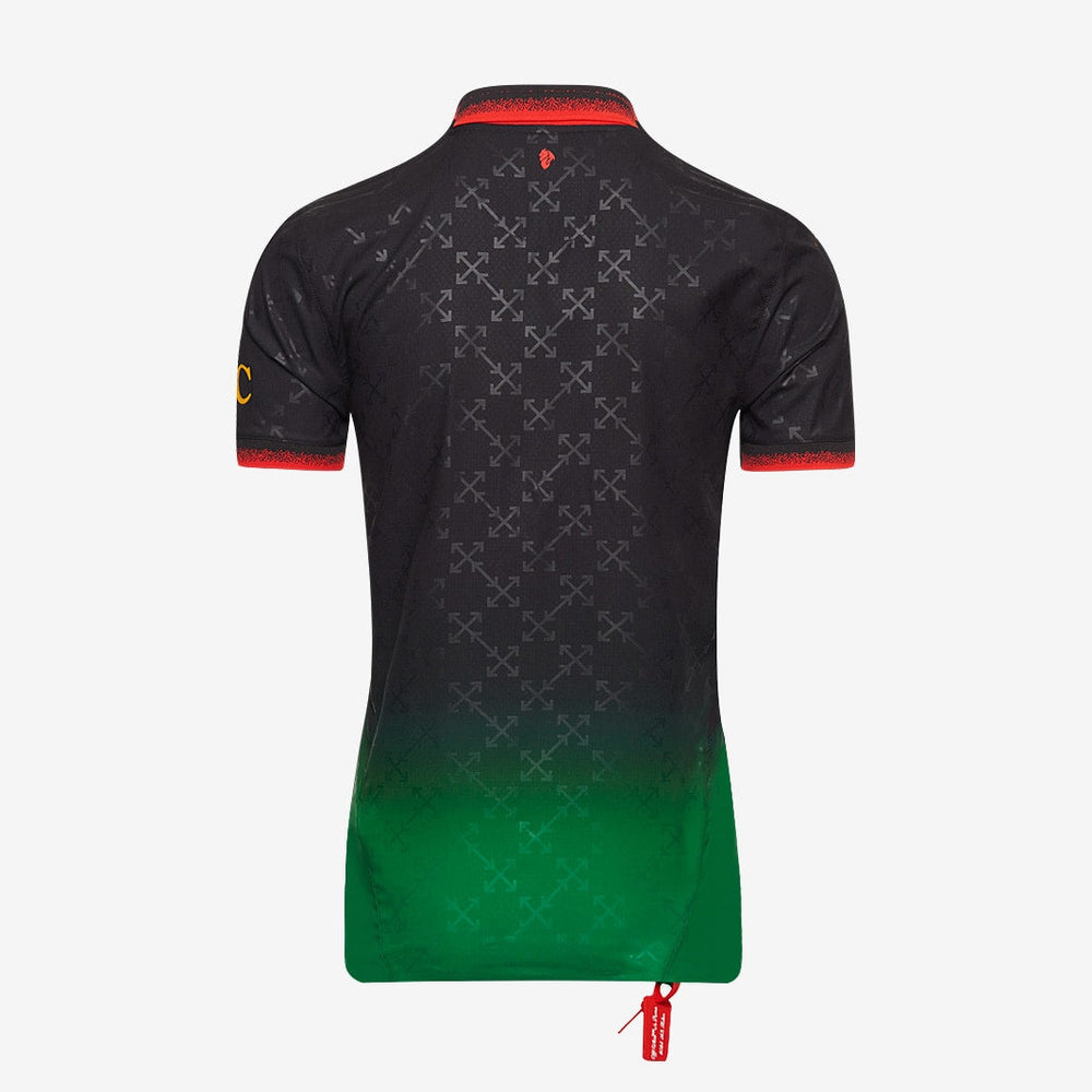 Part of a collaboration between streetwear icon Off-White and seven-time European champions AC Milan, the PUMA AC Milan x Off-White shirt displays your passion for the Rossoneri in striking style. The sleek PUMA Black base fades into a Power Green gradient towards the hem, and an all-over tonal pattern displays repeating Off-White four-way arrow designs to create a bold look that takes your fit to another level, on or off the pitch.