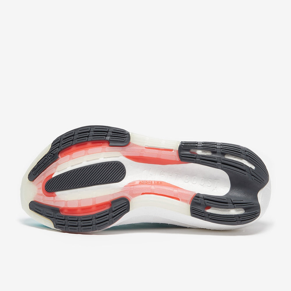 With a minimum 10% lower carbon footprint, and a Boost midsole foam that is more than 10% lighter than previous versions, the adidas Women's Ultraboost Light in Dash Grey/Silver Met./Wonder Blue improves performance, as well as sustainability.