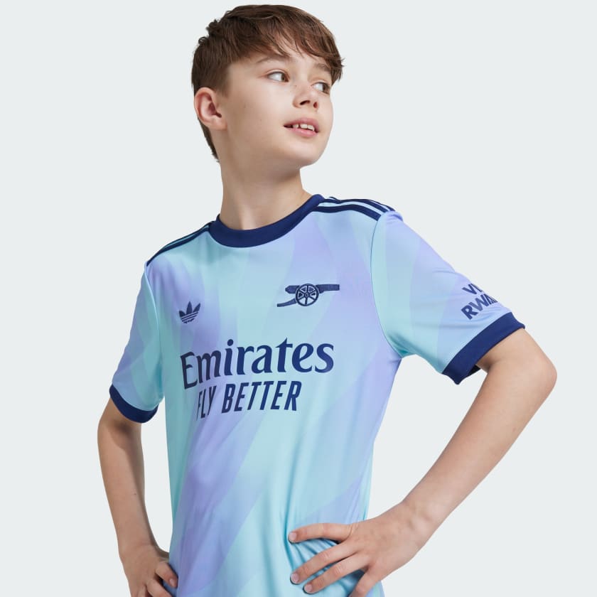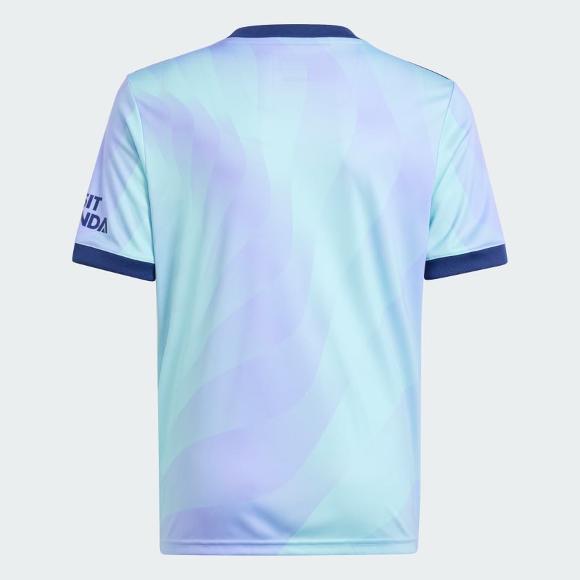 A fresh take on soccer heritage. Standing out in lilac and aqua, this juniors' Arsenal third jersey pairs a bold cannon badge with an iconic adidas Trefoil. The result? A vibrant look that will add color to dressing rooms, away ends and post-game celebrations.