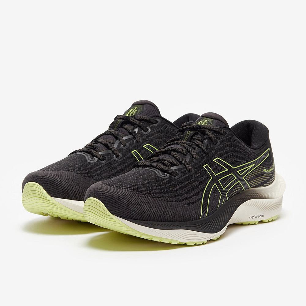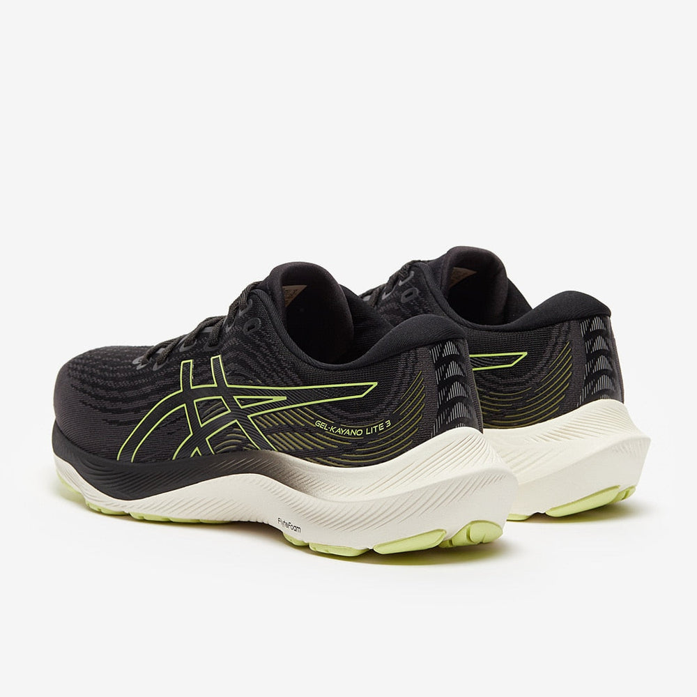 Designed to reduce overpronation and embrace a sound earth, the ASICS Gel-Kayano Lite 3 in Black/Glow Yellow uses more recycled polyester, a more environmental dyeing process and includes cushioning organically derived materials.