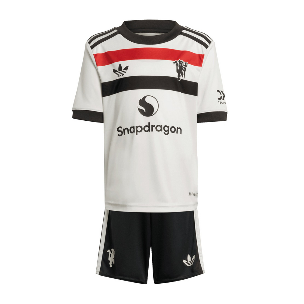 Created so the next generation of fans can unite behind the colours. This kids' Manchester United third kit mimics the tricolour flag-inspired design of the adidas match day strip. Interlock fabric and moisture-managing AEROREADY keep young fans comfortable as they practise their skills. A Trefoil and red devil on the chest complete a look full of football style.