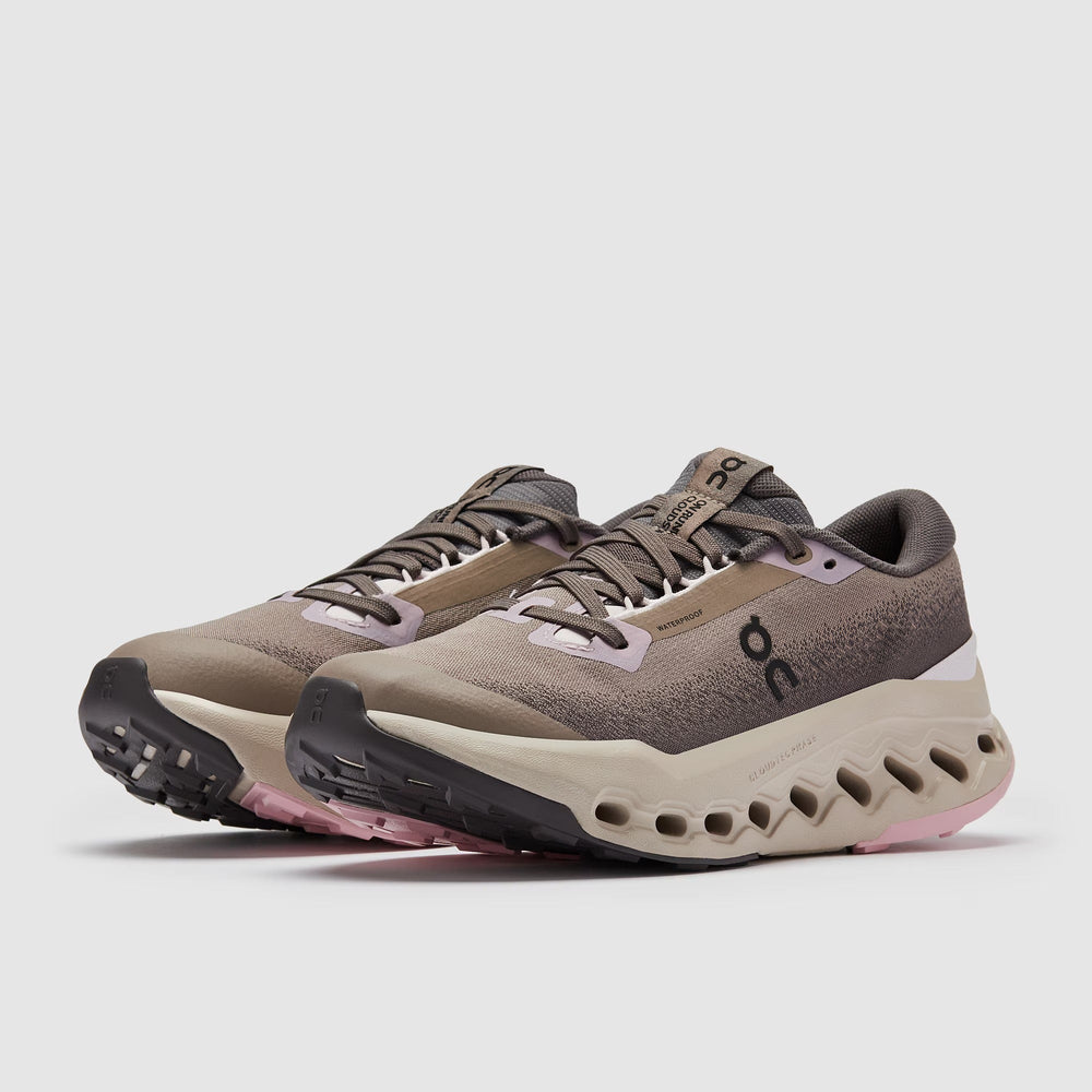 Built for light trail and training runs, the On Women's Cloudsurfer Trail 2 WP in Cinder/Desert updates an instant classic, with improved grip, fit, comfort, and a new waterproof resilient upper.