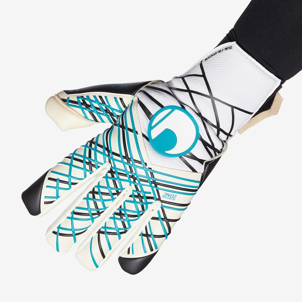Read the game and take control with Uhlsport Absolutgrip Tight HN goalkeeper gloves in White/Black/Fluo Blue, featuring a grip net structure on the backhand for improved flexibility and grip.