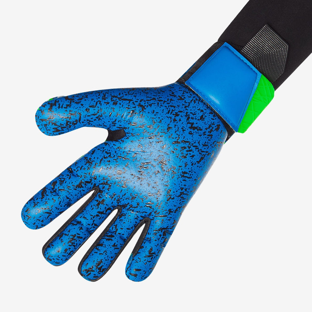 Read the game and take control with Uhlsport Aquagrip HN goalkeeper gloves in Blue/Green, featuring a grip net structure on the backhand for improved flexibility and grip.
